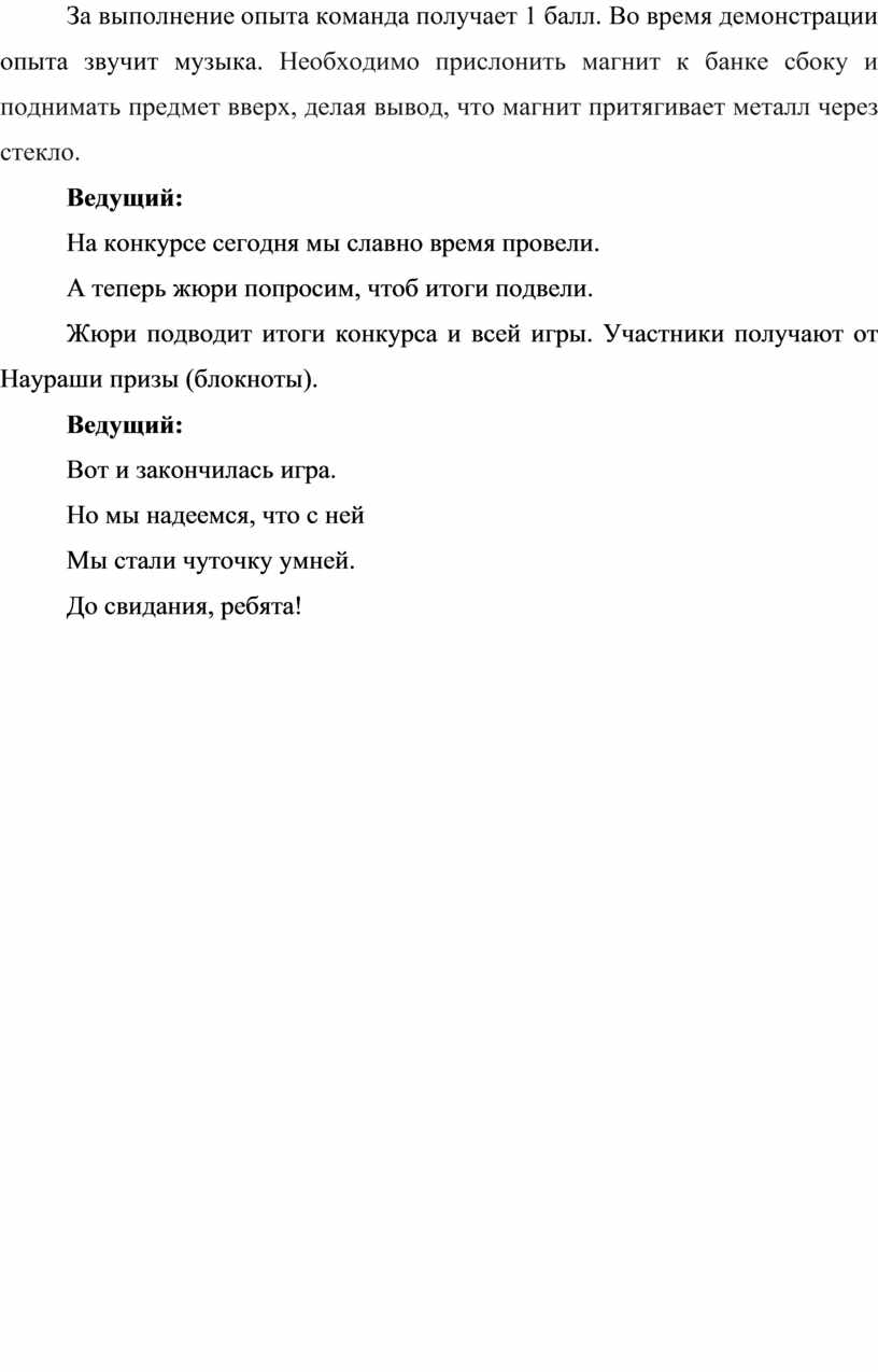 За выполнение опыта команда получает 1 балл. Во время демонстрации опыта звучит музыка. Необходимо прислонить магнит к банке сбоку и поднимать предмет вверх, делая вывод, что магнит притягивает металл через стекло.
