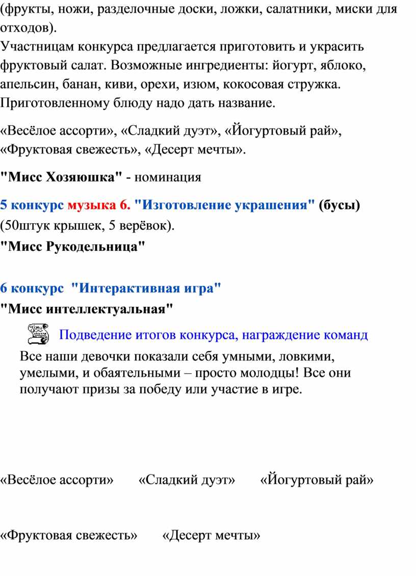«Весёлое ассорти», «Сладкий дуэт», «Йогуртовый рай», «Фруктовая свежесть», «Десерт мечты».