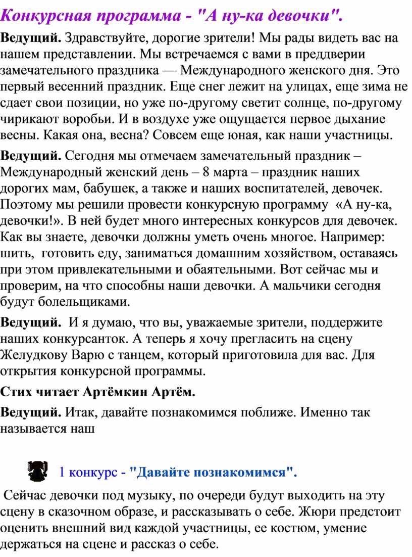 Ведущий. Сегодня мы отмечаем замечательный праздник – Международный женский день – 8 марта – праздник наших дорогих мам, бабушек, а также и наших воспитателей, девочек. Поэтому мы решили провести конкурсную программу «А ну-ка, девочки!». В ней будет много интересных конкурсов для девочек. Как вы знаете, девочки должны уметь очень многое. Например: шить, готовить еду, заниматься домашним хозяйством, оставаясь при этом привлекательными и обаятельными. Вот сейчас мы и проверим, на что способны наши девочки. А мальчики сегодня будут болельщиками.