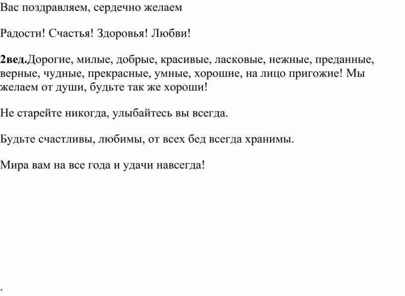 2вед.Дорогие, милые, добрые, красивые, ласковые, нежные, преданные, верные, чудные, прекрасные, умные, хорошие, на лицо пригожие! Мы желаем от души, будьте так же хороши!