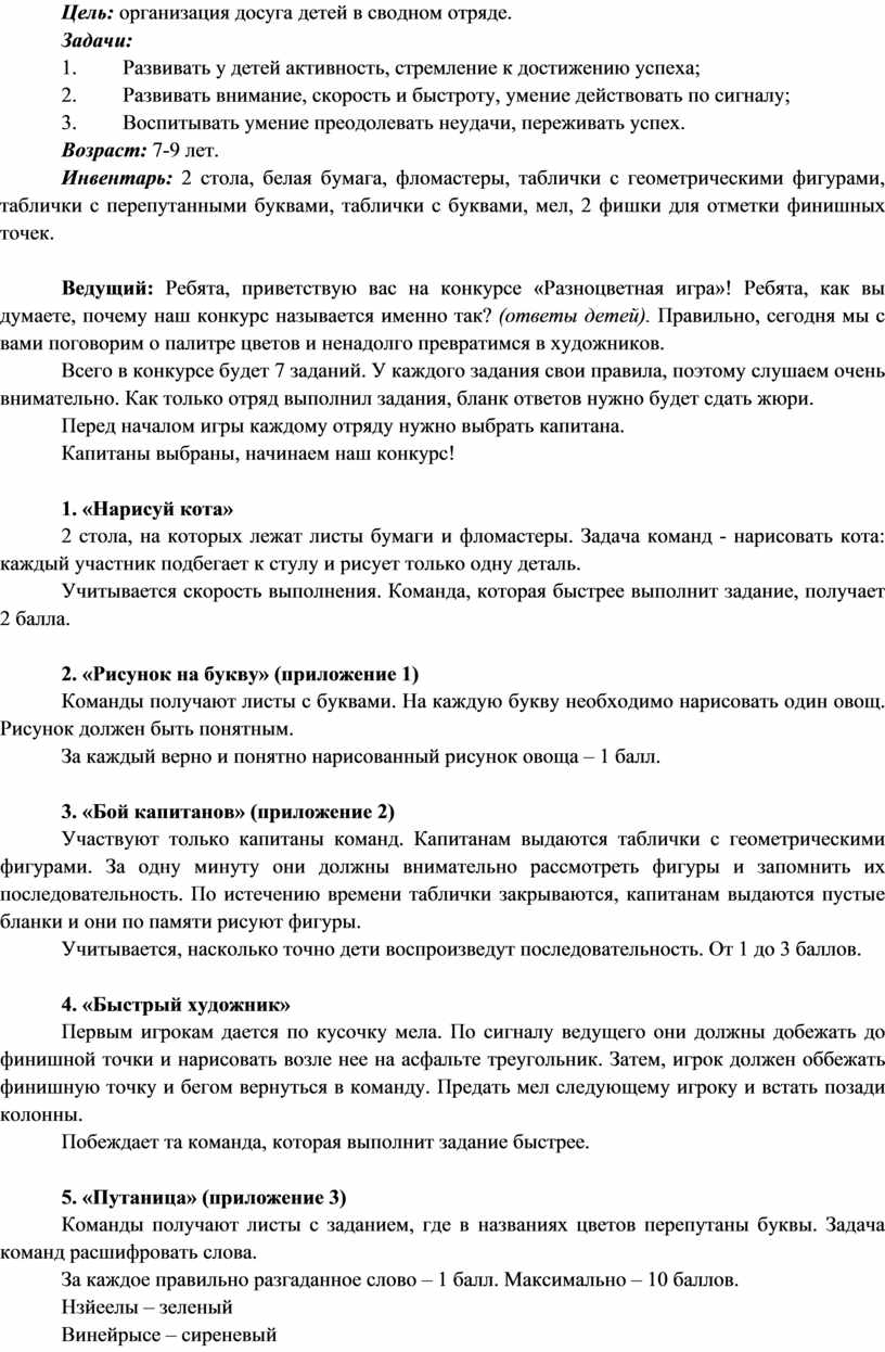 Цель: организация досуга детей в сводном отряде.