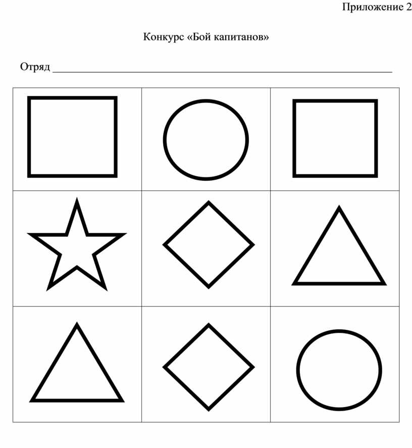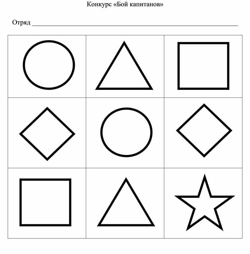 Участвуют только капитаны команд. Капитанам выдаются таблички с геометрическими фигурами. За одну минуту они должны внимательно рассмотреть фигуры и запомнить их последовательность. По истечению времени таблички закрываются, капитанам выдаются пустые бланки и они по памяти рисуют фигуры.
