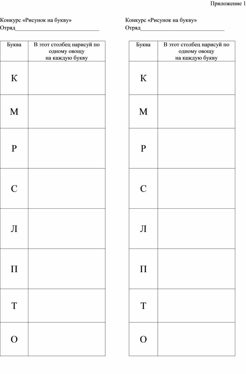 В этот столбец нарисуй по одному овощу на каждую букву |