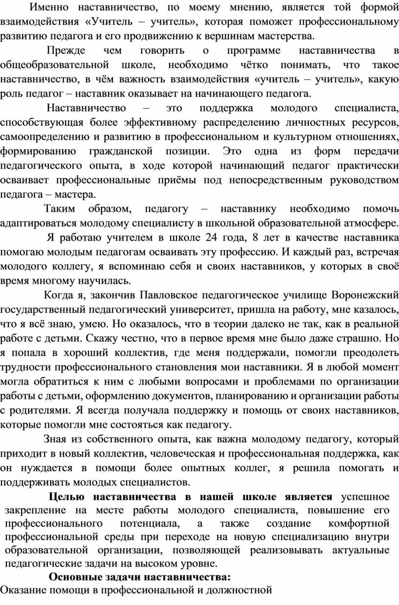Прежде чем говорить о программе наставничества в общеобразовательной школе, необходимо чётко понимать, что такое наставничество, в чём важность взаимодействия «учитель – учитель», какую роль педагог – наставник оказывает на начинающего педагога.
