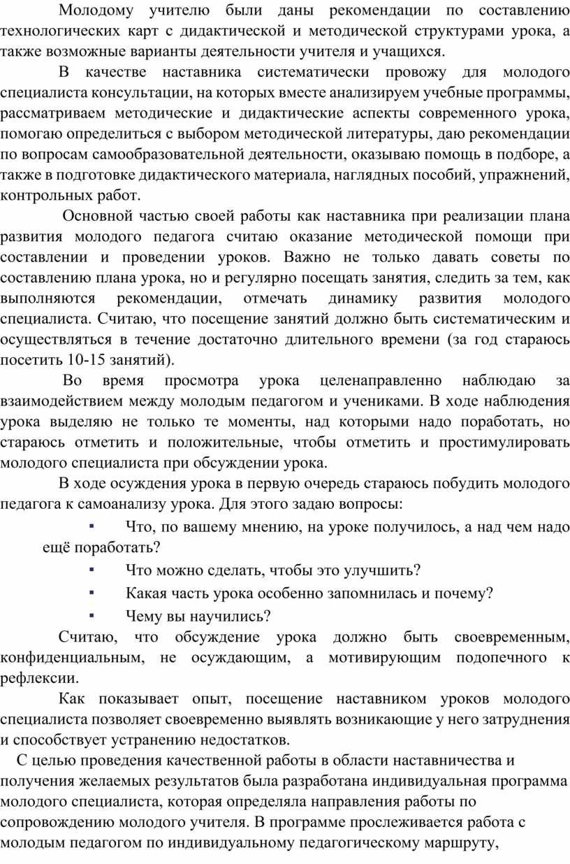 В качестве наставника систематически провожу для молодого специалиста консультации, на которых вместе анализируем учебные программы, рассматриваем методические и дидактические аспекты современного урока, помогаю определиться с выбором методической литературы, даю рекомендации по вопросам самообразовательной деятельности, оказываю помощь в подборе, а также в подготовке дидактического материала, наглядных пособий, упражнений, контрольных работ.