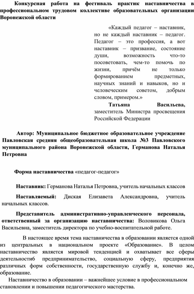 Конкурсная работа на фестиваль практик наставничества в профессиональном трудовом коллективе образовательных организации Воронежской области