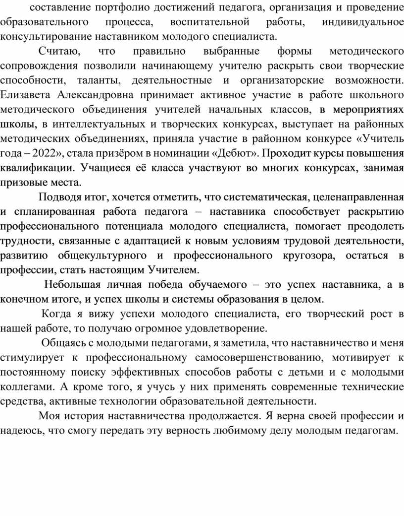 Считаю, что правильно выбранные формы методического сопровождения позволили начинающему учителю раскрыть свои творческие способности, таланты, деятельностные и организаторские возможности. Елизавета Александровна принимает активное участие в работе школьного методического объединения учителей начальных классов, в мероприятиях школы, в интеллектуальных и творческих конкурсах, выступает на районных методических объединениях, приняла участие в районном конкурсе «Учитель года – 2022», стала призёром в номинации «Дебют». Проходит курсы повышения квалификации. Учащиеся её класса участвуют во многих конкурсах, занимая призовые места.