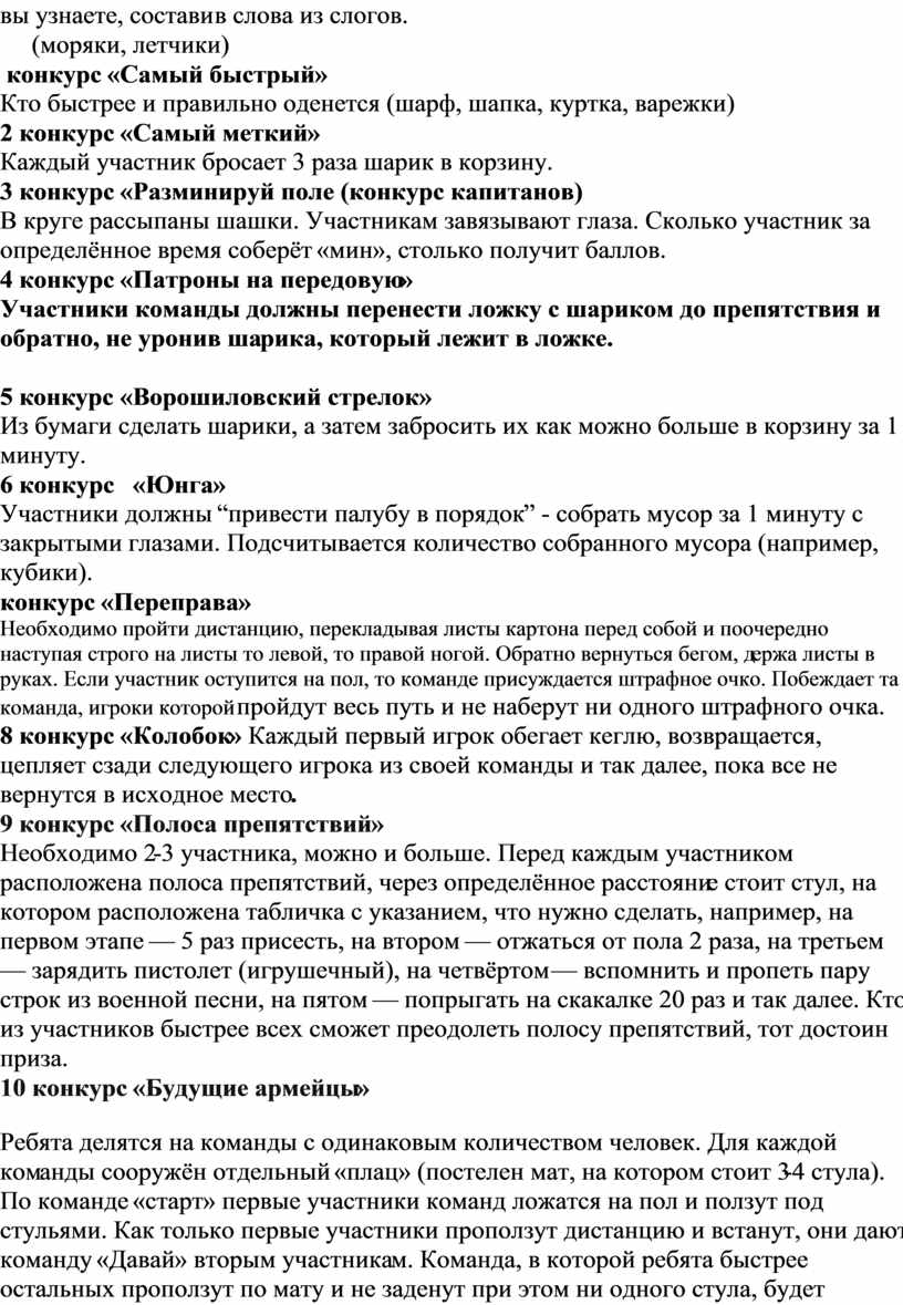 Необходимо 2-3 участника, можно и больше. Перед каждым участником расположена полоса препятствий, через определённое расстояние стоит стул, на котором расположена табличка с указанием, что нужно сделать, например, на первом этапе — 5 раз присесть, на втором — отжаться от пола 2 раза, на третьем — зарядить пистолет (игрушечный), на четвёртом — вспомнить и пропеть пару строк из военной песни, на пятом — попрыгать на скакалке 20 раз и так далее. Кто из участников быстрее всех сможет преодолеть полосу препятствий, тот достоин приза.
