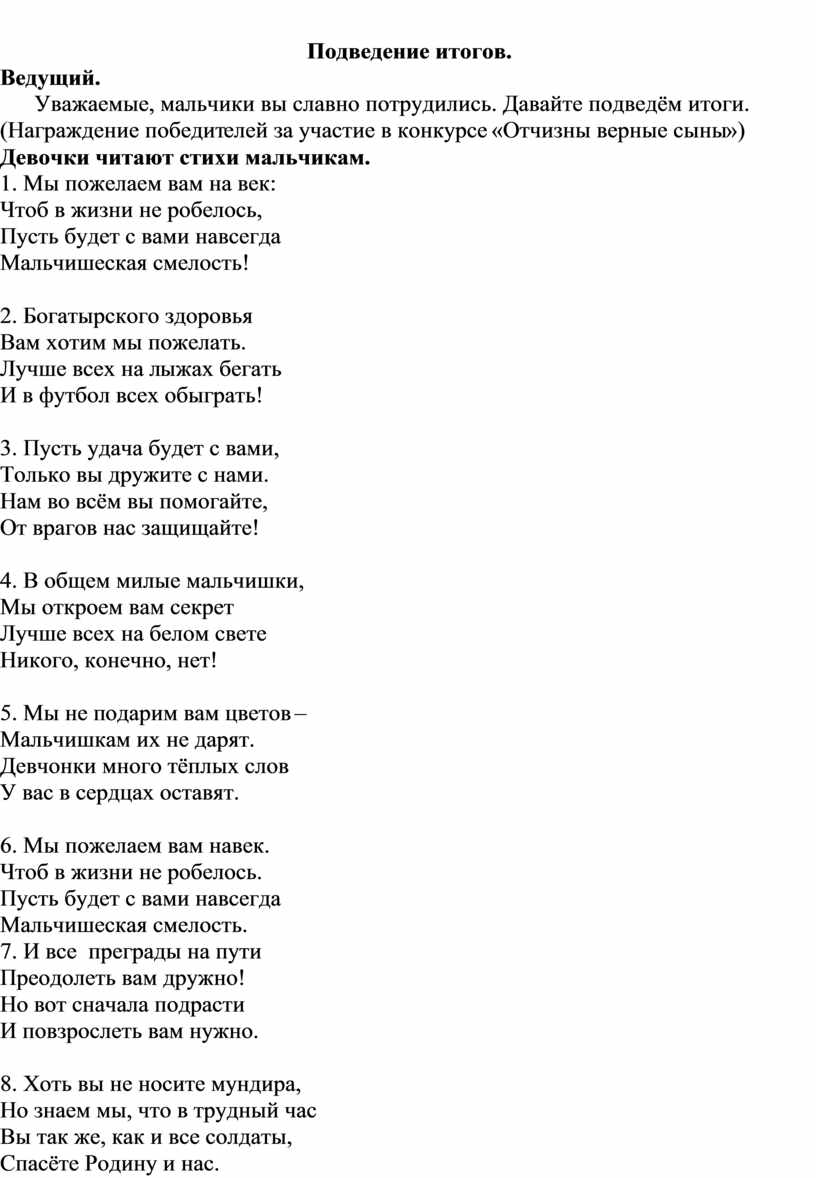 Уважаемые, мальчики вы славно потрудились. Давайте подведём итоги.