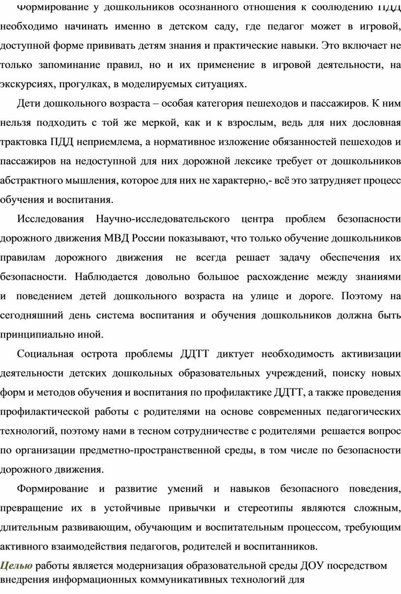 Целью работы является модернизация образовательной среды ДОУ посредством внедрения информационных коммуникативных технологий для повышения эффективности работы с детьми по профилактике детского дорожно-транспортного травматизма, с целью сохранения психофизиологического здоровья детей, повышения компетентности педагогов и родителей.