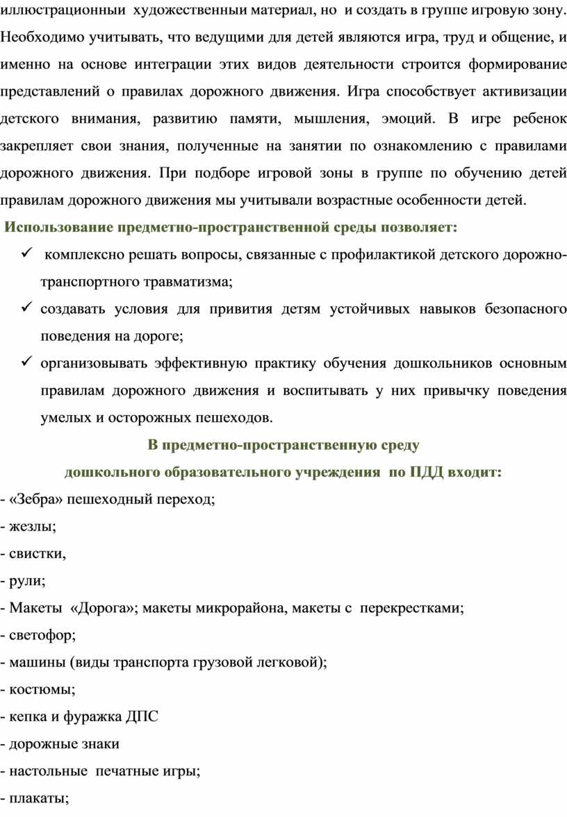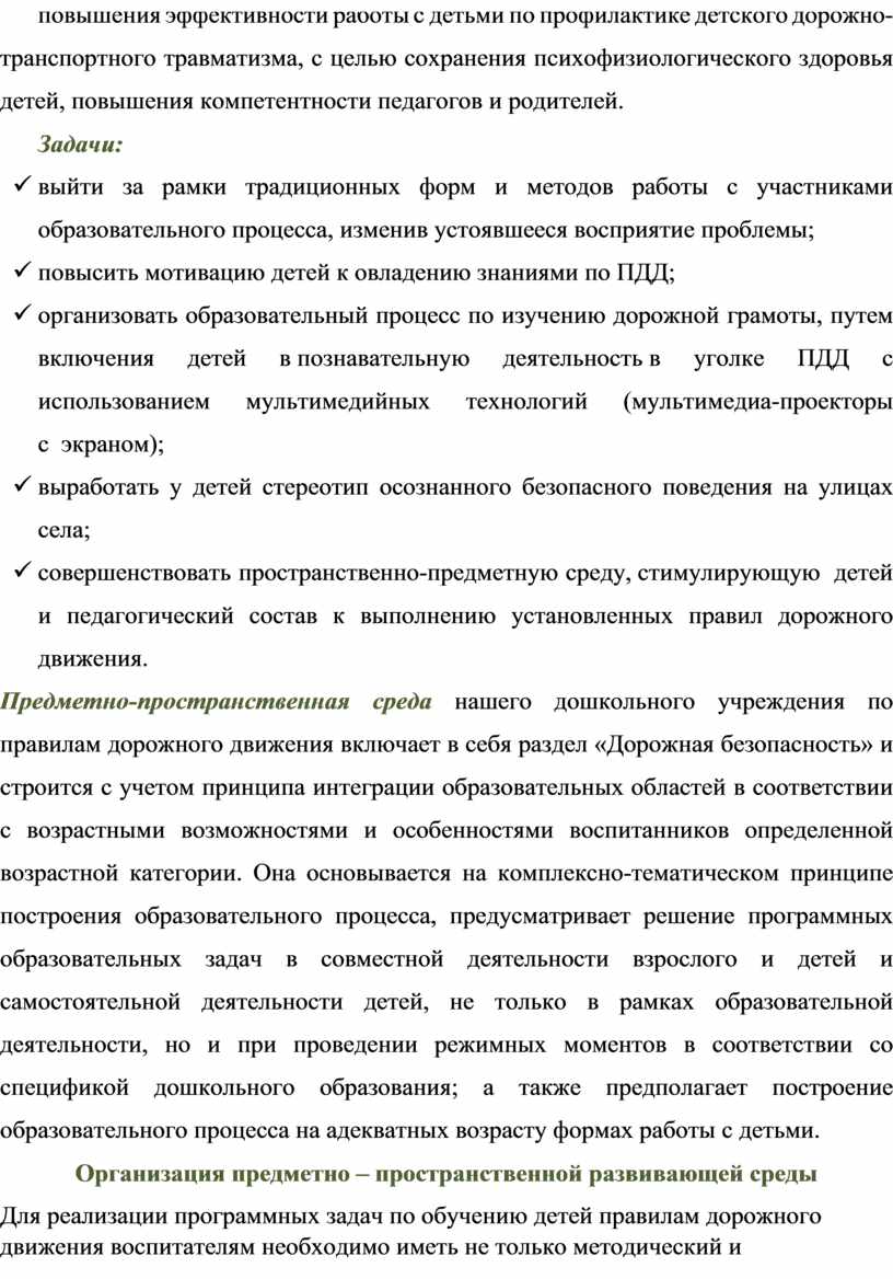 Предметно-пространственная среда нашего дошкольного учреждения по правилам дорожного движения включает в себя раздел «Дорожная безопасность» и строится с учетом принципа интеграции образовательных областей в соответствии с возрастными возможностями и особенностями воспитанников определенной возрастной категории. Она основывается на комплексно-тематическом принципе построения образовательного процесса, предусматривает решение программных образовательных задач в совместной деятельности взрослого и детей и самостоятельной деятельности детей, не только в рамках образовательной деятельности, но и при проведении режимных моментов в соответствии со спецификой дошкольного образования; а также предполагает построение образовательного процесса на адекватных возрасту формах работы с детьми.