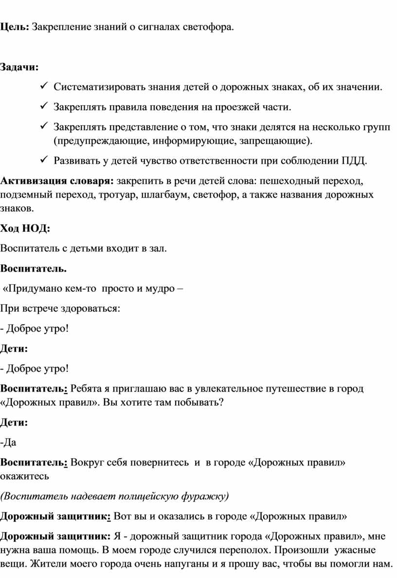 -закрепить представления детей о светофоре и дорожных знаках; -закрепить представление о сигналах светофора; -систематизировать знания детей о правилах дорожного движения;
