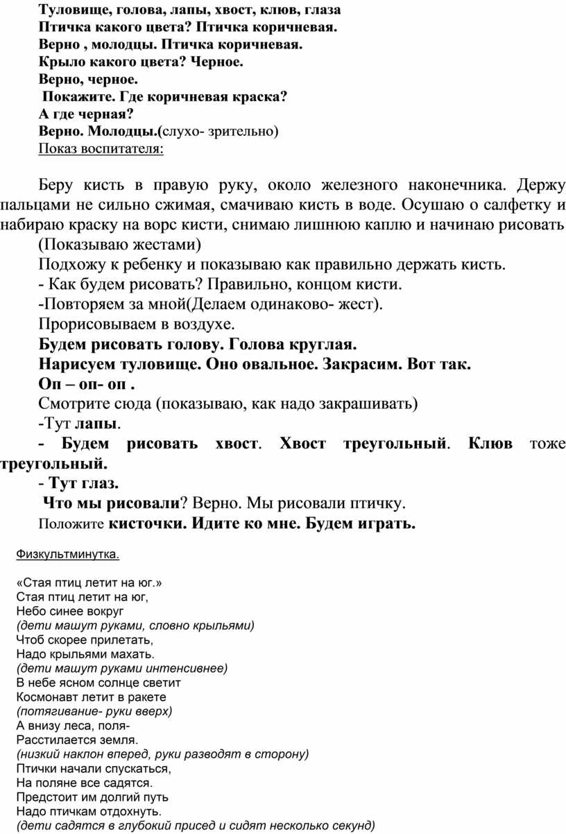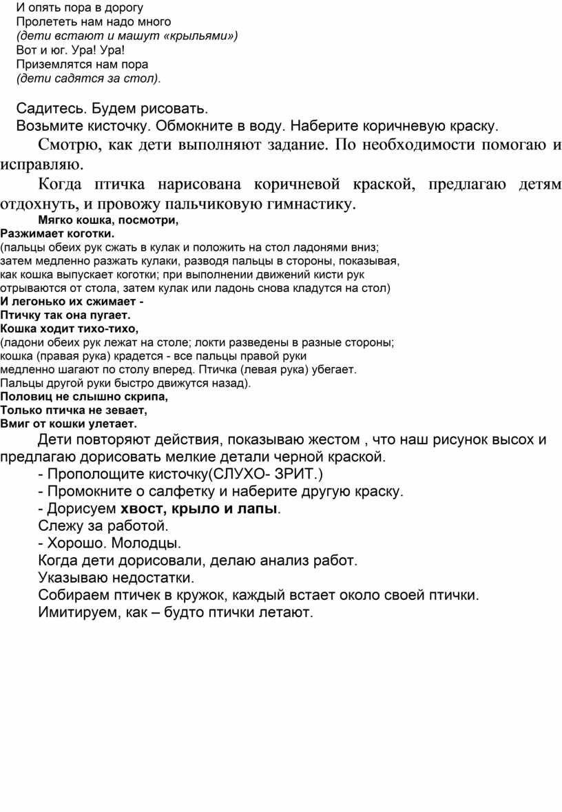 Образовательные. Продолжать знакомить детей с птицами, их строением; закрепить основные цвета – коричневый, черный.
