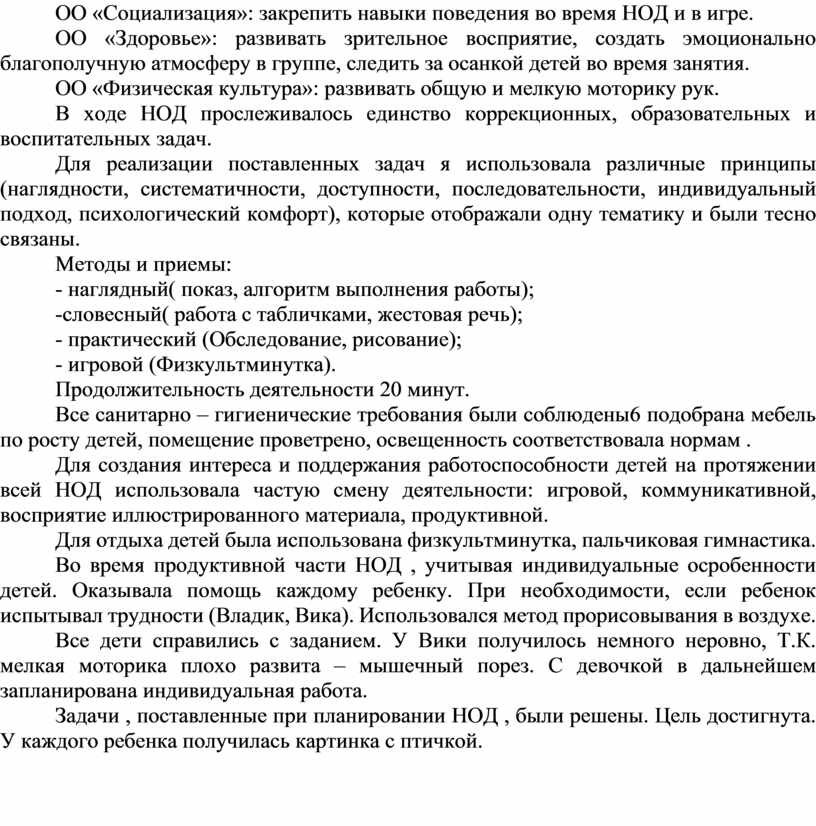 Задачи , поставленные при планировании НОД , были решены. Цель достигнута. У каждого ребенка получилась картинка с птичкой.