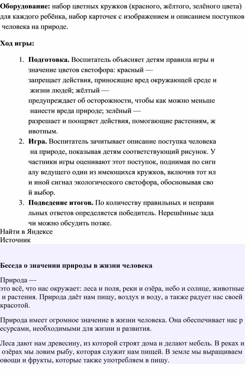 Оборудование: набор цветных кружков (красного, жёлтого, зелёного цвета) для каждого ребёнка, набор карточек с изображением и описанием поступков человека на природе.