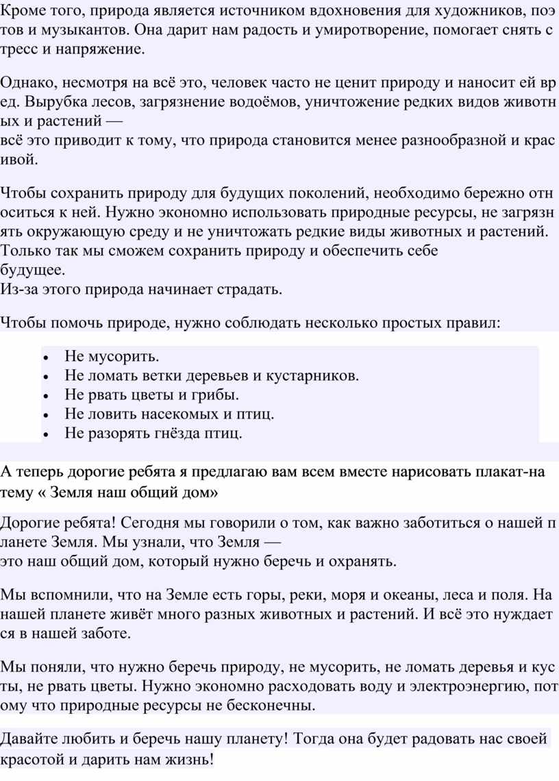 Мы должны беречь природу, не мусорить, не ломать деревья и кусты, не рвать цветы. Нужно экономно расходовать воду и