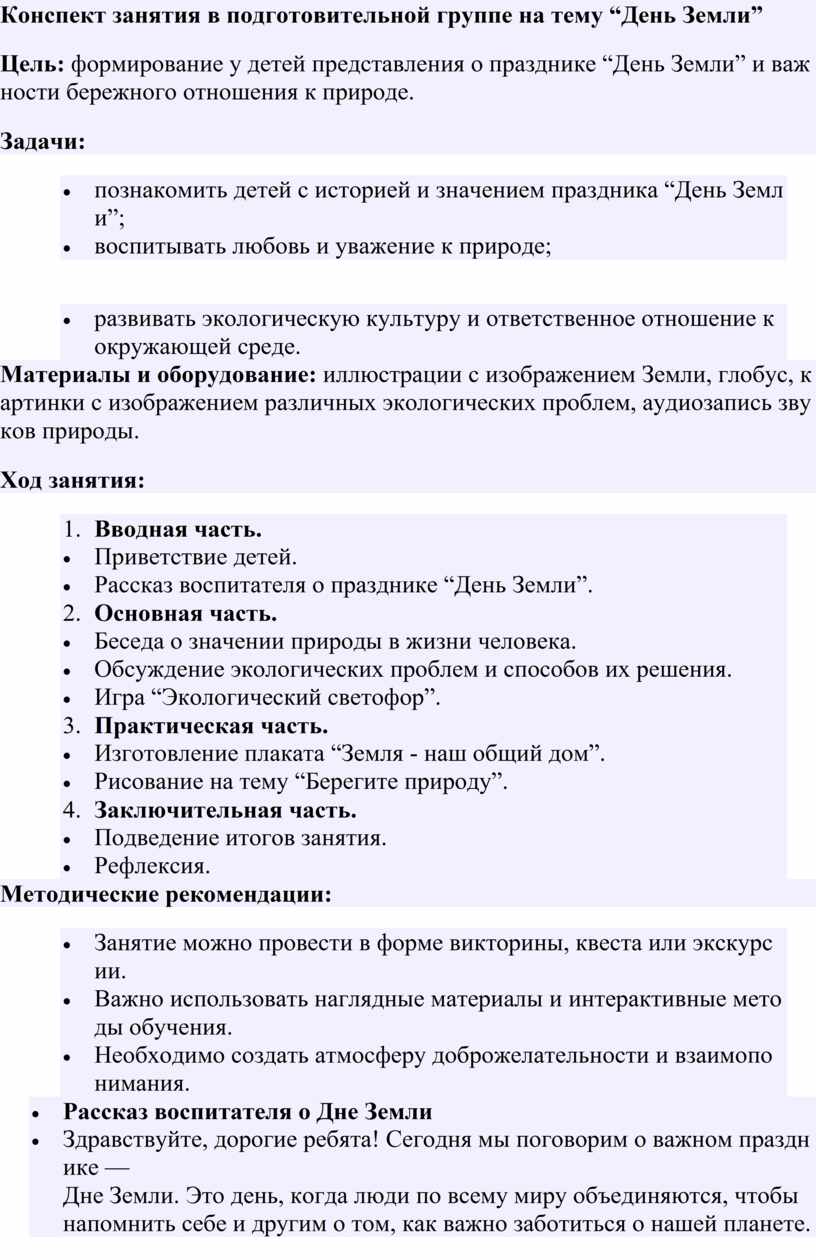Конспект занятия в подготовительной группе на тему “День Земли”