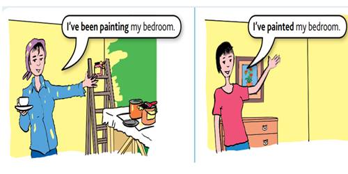 So as you see, we use Present Perfect Continuous when we talk about the actions which are in progress, like in this picture, we see a woman who is still painting the walls. We use Present Perfect to express the actions which have been fulfilled as we see another woman who has already painted the walls. Looking at the examples in the texts, can you try and figure out the structure of the tenses?