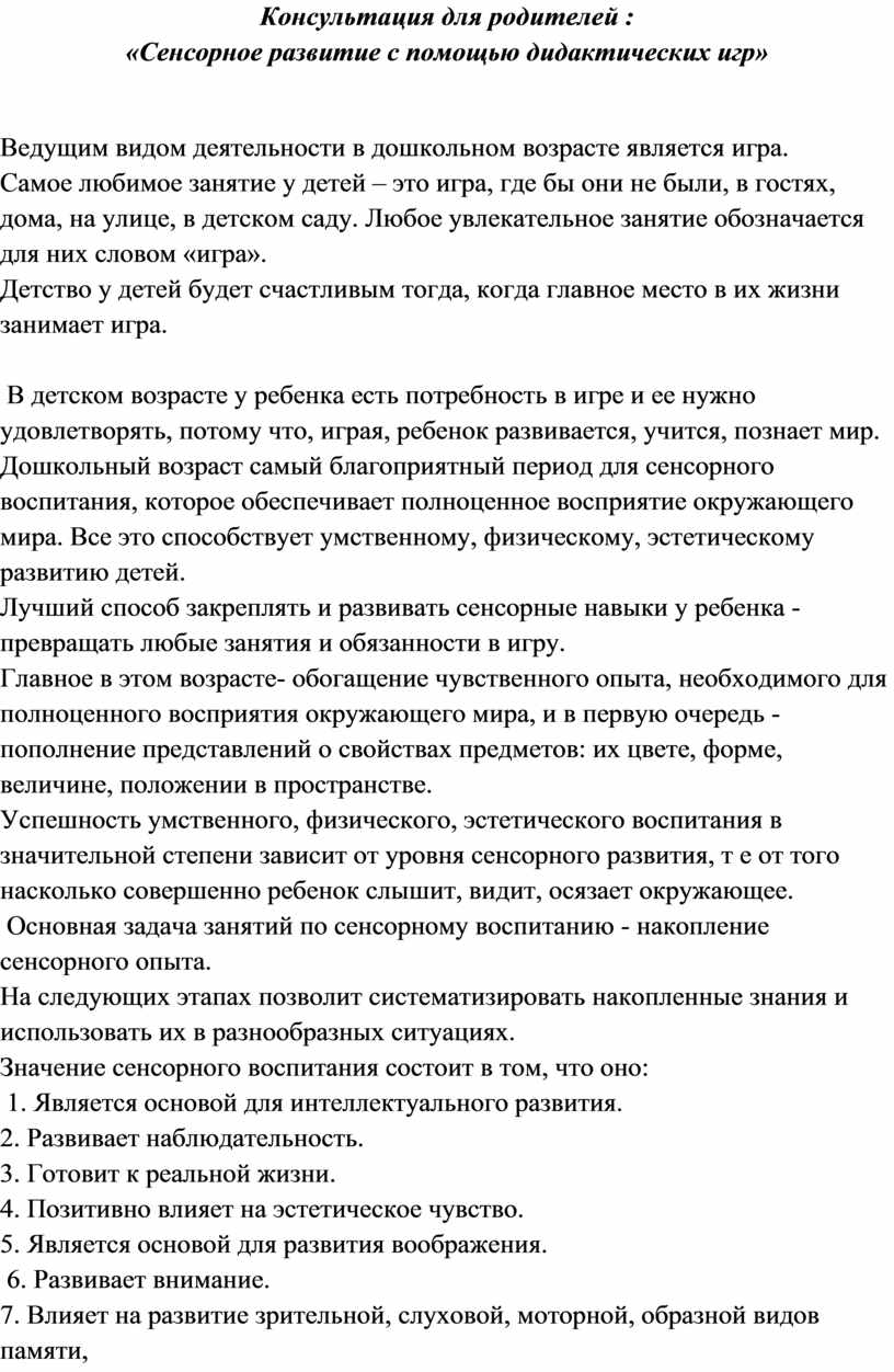 Успешность умственного, физического, эстетического воспитания в значительной степени зависит от уровня сенсорного развития, т е от того насколько совершенно ребенок слышит, видит, осязает окружающее.