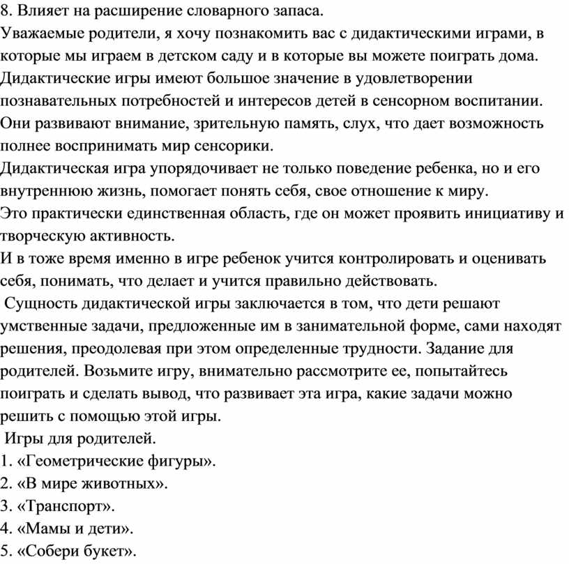 Дидактическая игра упорядочивает не только поведение ребенка, но и его внутреннюю жизнь, помогает понять себя, свое отношение к миру.