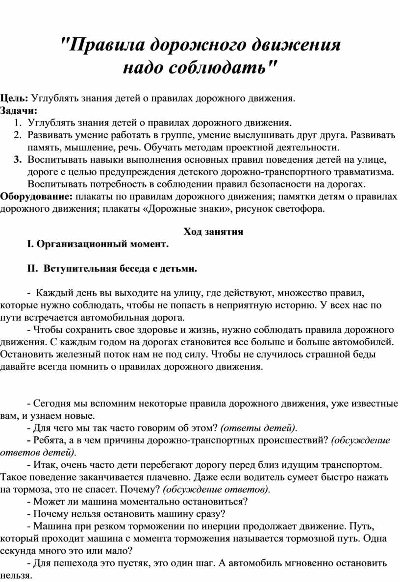 Оборудование: плакаты по правилам дорожного движения; памятки детям о правилах дорожного движения; плакаты «Дорожные знаки», рисунок светофора.