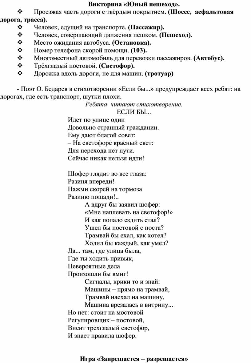 - Поэт О. Бедарев в стихотворении «Если бы...» предупреждает всех ребят: на дорогах, где есть транспорт, шутки плохи.