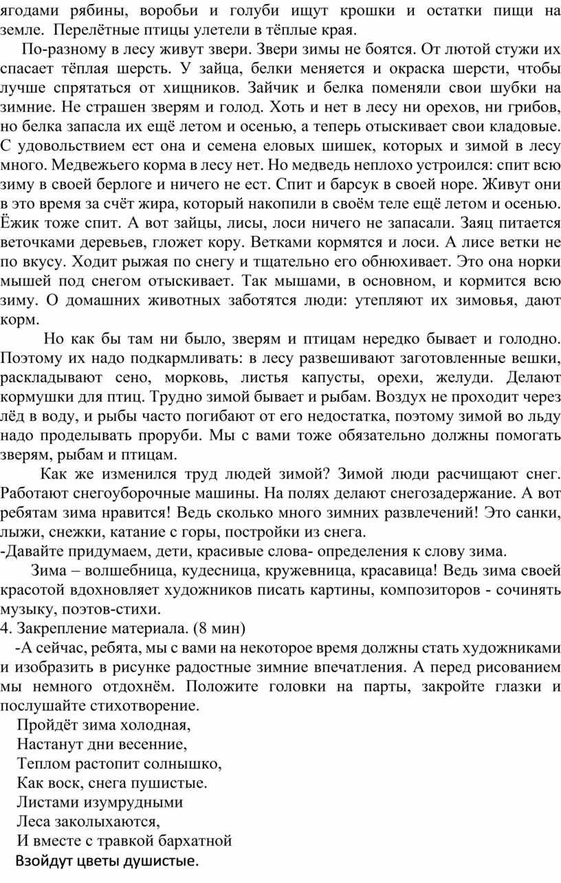 -А сейчас, ребята, мы с вами на некоторое время должны стать художниками и изобразить в рисунке радостные зимние впечатления. А перед рисованием мы немного отдохнём. Положите головки на парты, закройте глазки и послушайте стихотворение.