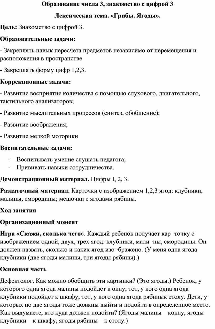 Дефектолог показывает детям различные цифры и дает задания: «Покажи цифру три: три ягоды смородины, одна ягода облепихи, две ягоды земляники, три ягоды черники, одна ягода клубники, три ягоды клюквы. Хлопни в ладоши, когда увидишь цифру три».