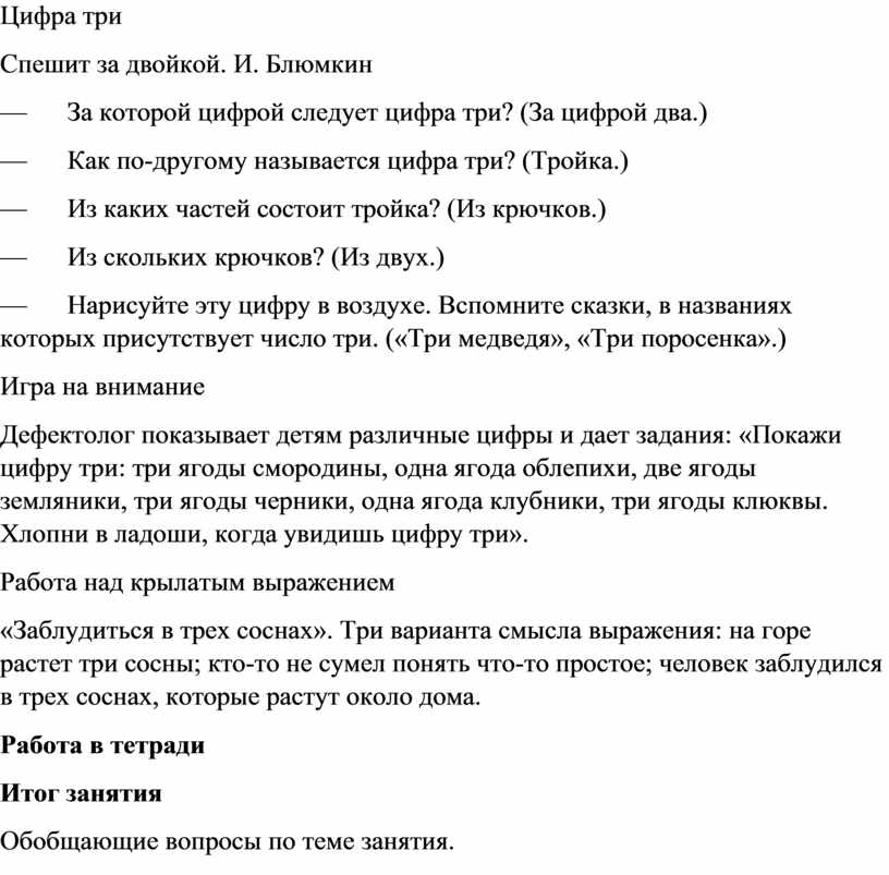 — Нарисуйте эту цифру в воздухе. Вспомните сказки, в названиях которых присутствует число три. («Три медведя», «Три поросенка».)