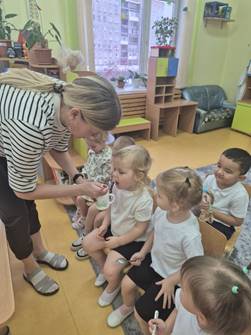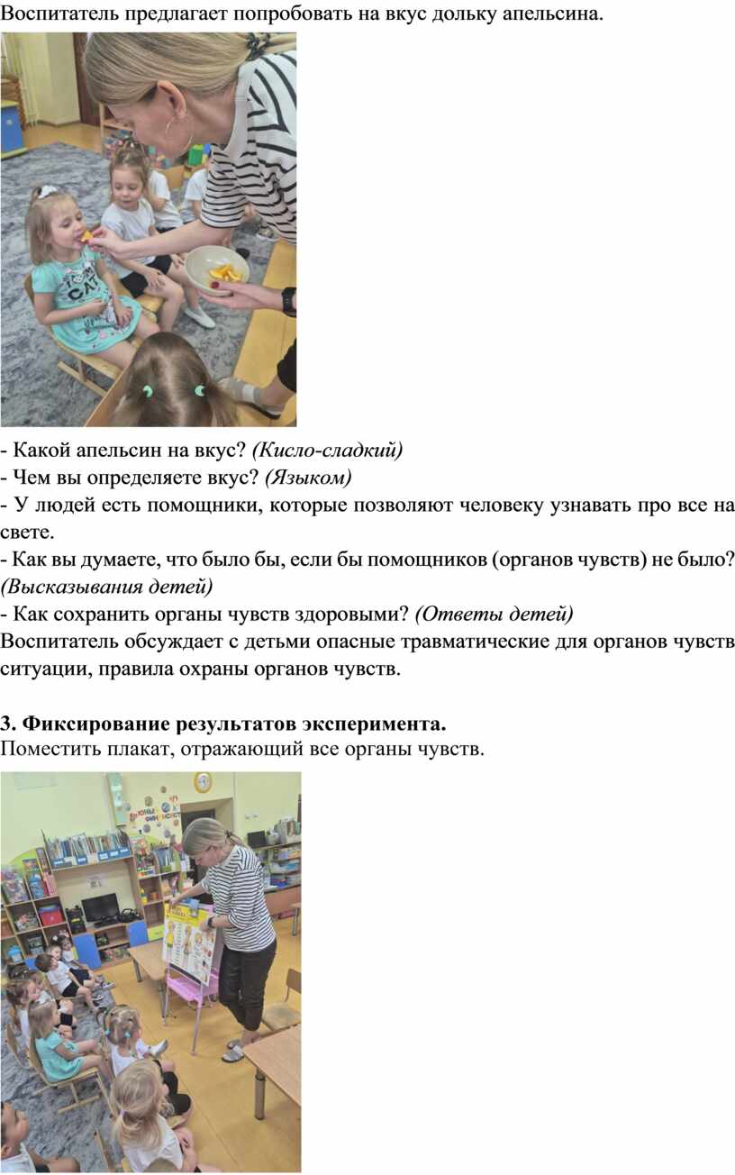 Воспитатель предлагает попробовать на вкус дольку апельсина.
