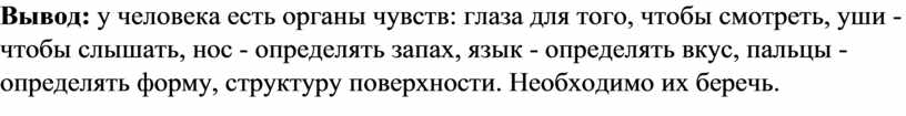 Вывод: у человека есть органы чувств: глаза для того, чтобы смотреть, уши - чтобы слышать, нос - определять запах, язык - определять вкус, пальцы - определять форму, структуру поверхности. Необходимо их беречь.