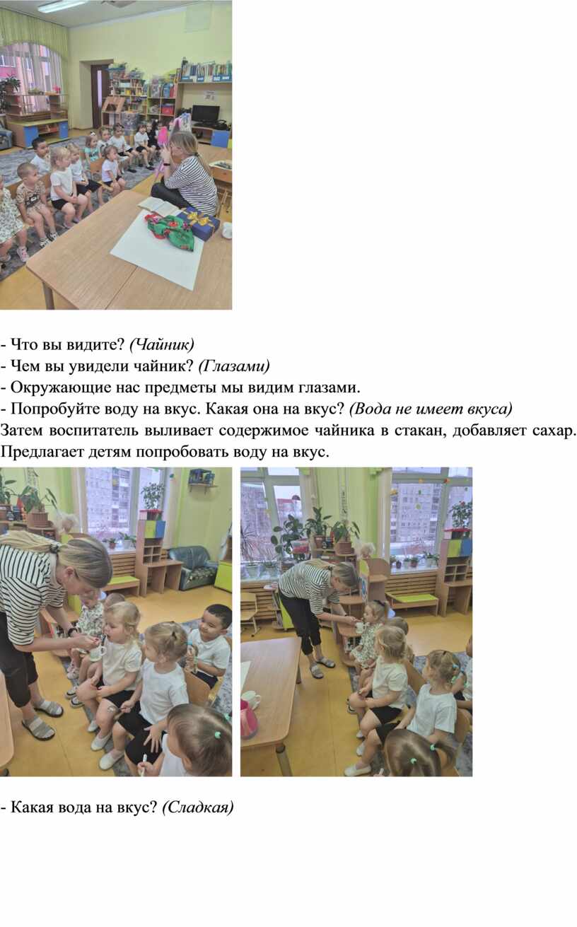 Затем воспитатель выливает содержимое чайника в стакан, добавляет сахар. Предлагает детям попробовать воду на вкус.