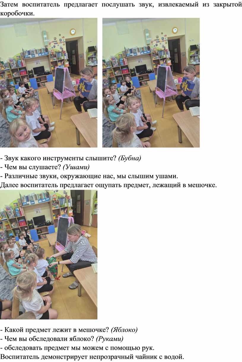 Затем воспитатель предлагает послушать звук, извлекаемый из закрытой коробочки.