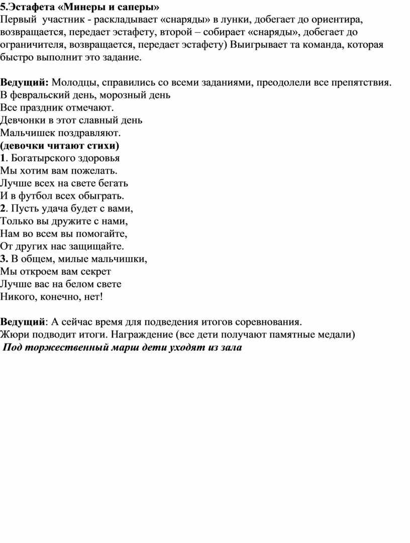 Ведущий: Ребята, а как вы думаете, какими должны быть солдаты? (Ответы детей.) Они должны быть и смелыми, и выносливыми, и сильными… А помогают им в этом занятия физкультурой и спортом.