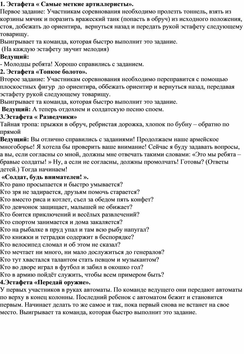 Ведущий: Вы отлично справились с заданиями! Продолжаем наше армейское многоборье! Я хотела бы проверить ваше внимание! Сейчас я буду задавать вопросы, а вы, если согласны со мной, должны мне отвечать такими словами: «Это мы ребята – бравые солдаты! » Ну, а если не согласны, должны промолчать! Готовы? (Ответы детей.) Тогда начинаем!