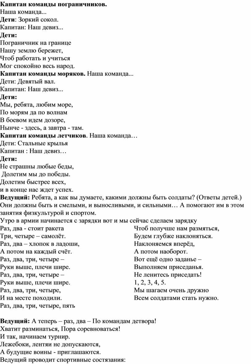 Наши мальчишки еще ходят в детский сад, но пройдут годы, и они выберут для себя любую военную специальность, армия научит их быть выносливыми, смелыми и ловкими. В этот праздничный день приглашаю вас принять участие в турнире будущих воинов, где вы сможете проявить свою сноровку, смекалку, силу и выдержку. Представляю две команды: команда пограничников и команда моряков.