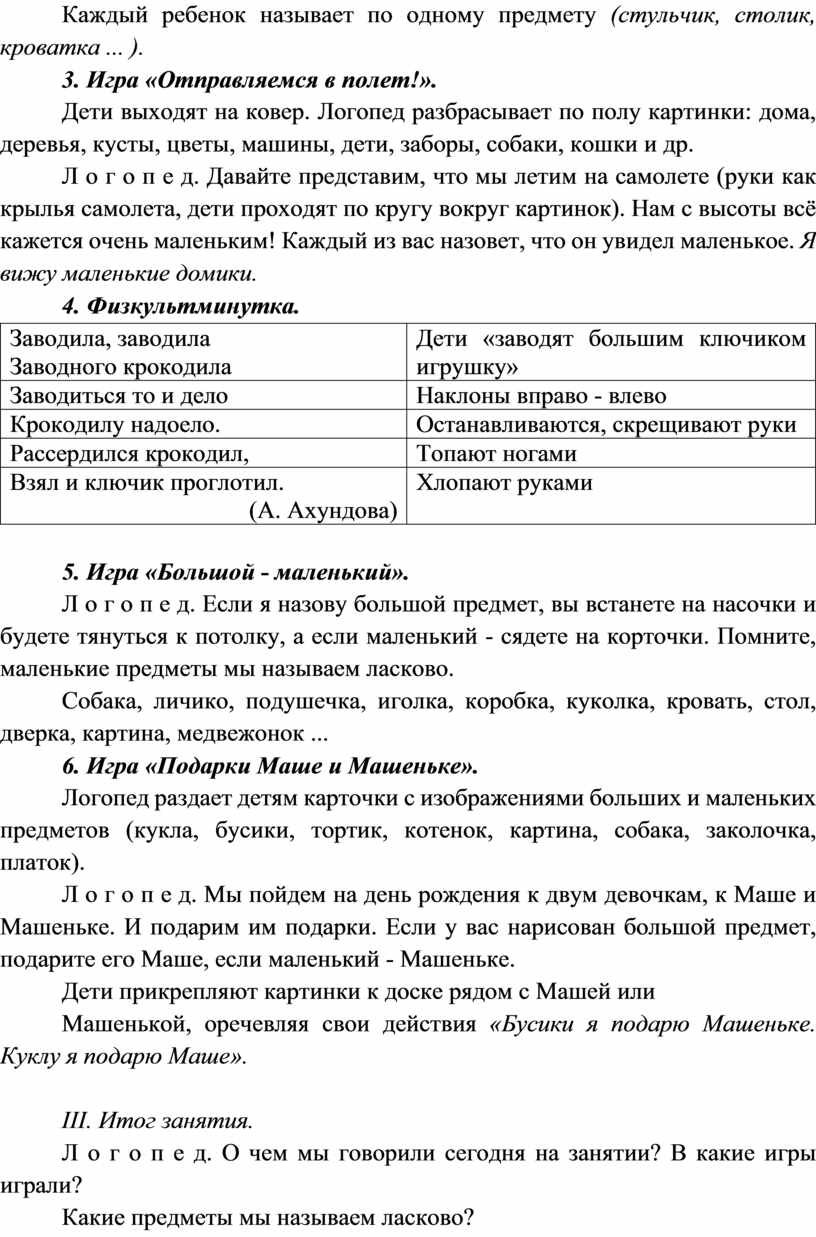 Л о г о п е д. Если я назову большой предмет, вы встанете на насочки и будете тянуться к потолку, а если маленький - сядете на корточки. Помните, маленькие предметы мы называем ласково.