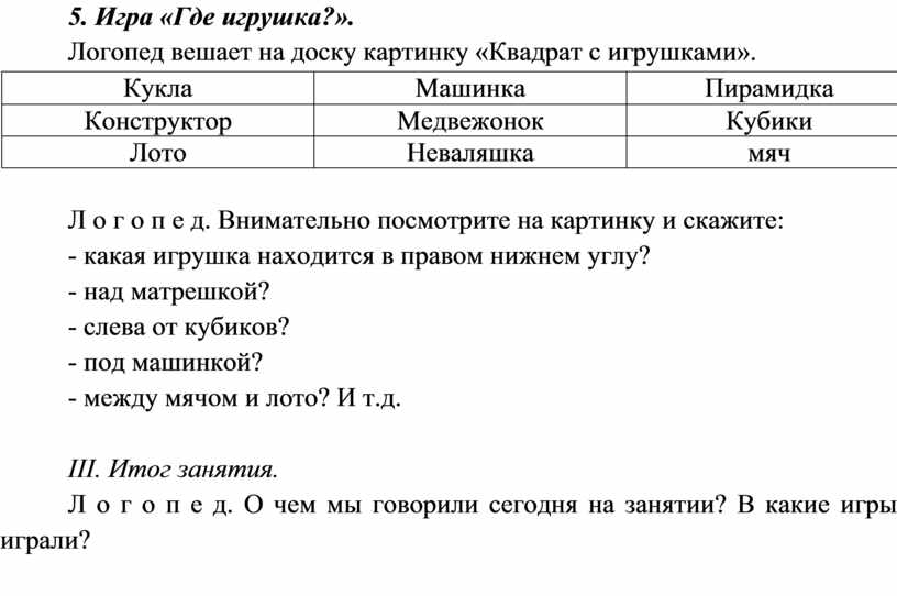 Игра повторяется 3-4 раза с дальнейшим усложнением (логопед убирает две игрушки).