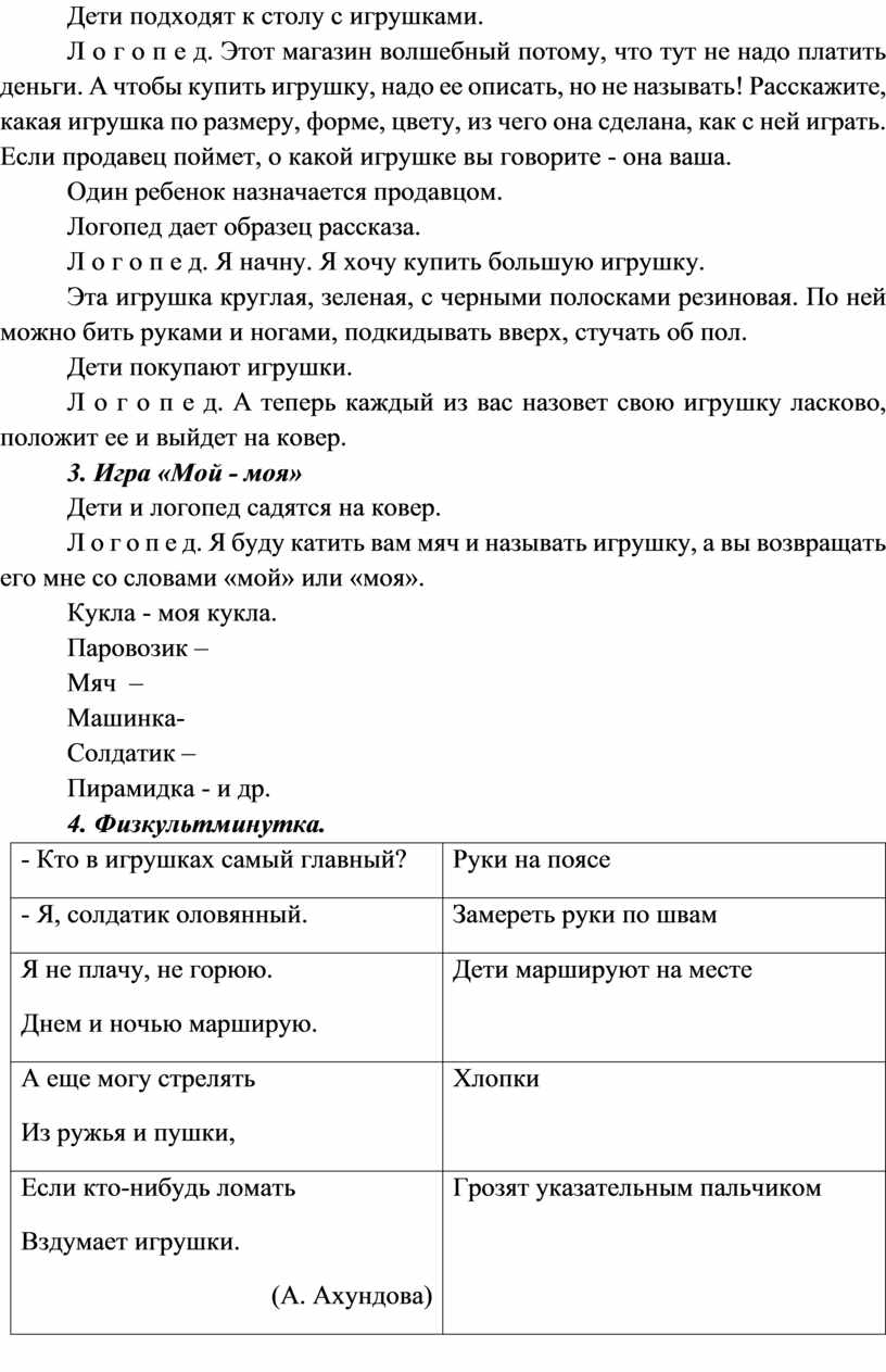 Л о г о п е д. Этот магазин волшебный потому, что тут не надо платить деньги. А чтобы купить игрушку, надо ее описать, но не называть! Расскажите, какая игрушка по размеру, форме, цвету, из чего она сделана, как с ней играть. Если продавец поймет, о какой игрушке вы говорите - она ваша.