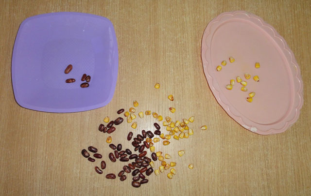 Воспитатель: Дети, уточка и курица рассорились из-за корма, помогите разобрать зерна: вот в эту тарелку складываем кукурузу для курочки, а вот здесь складываем фасоль.