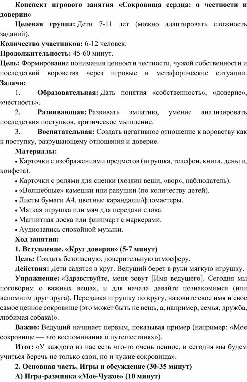 Конспект игрового занятия «Сокровища сердца: о честности и доверии»