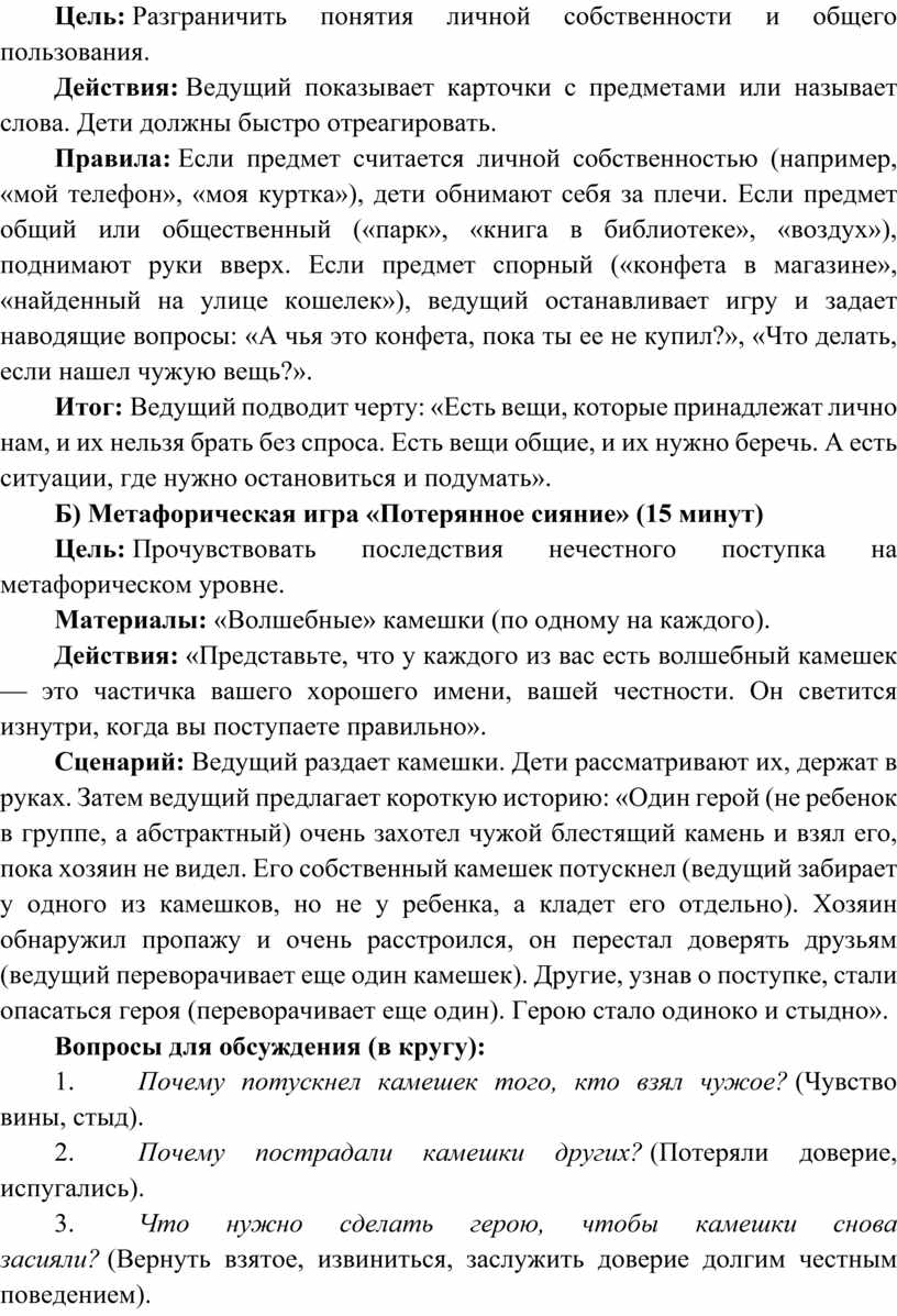 Сценарий: Ведущий раздает камешки. Дети рассматривают их, держат в руках. Затем ведущий предлагает короткую историю: «Один герой (не ребенок в группе, а абстрактный) очень захотел чужой блестящий камень и взял его, пока хозяин не видел. Его собственный камешек потускнел (ведущий забирает у одного из камешков, но не у ребенка, а кладет его отдельно). Хозяин обнаружил пропажу и очень расстроился, он перестал доверять друзьям (ведущий переворачивает еще один камешек). Другие, узнав о поступке, стали опасаться героя (переворачивает еще один). Герою стало одиноко и стыдно».