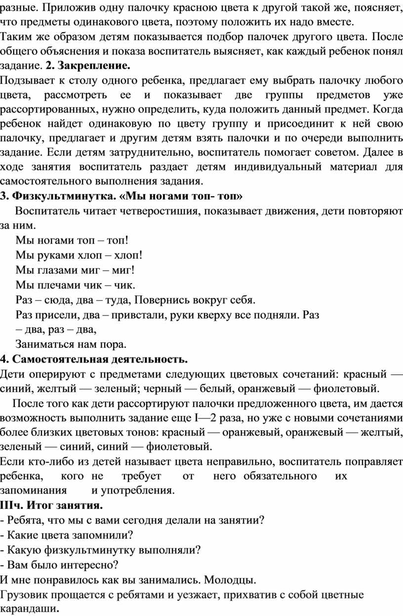 Таким же образом детям показывается подбор палочек другого цвета. После общего объяснения и показа воспитатель выясняет, как каждый ребенок понял задание. 2. Закрепление.