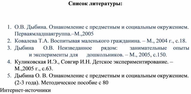 3. Дыбина О.В. Неизведанное рядом: занимательные опыты и эксперименты для дошкольников. – М., 2005, с.150.