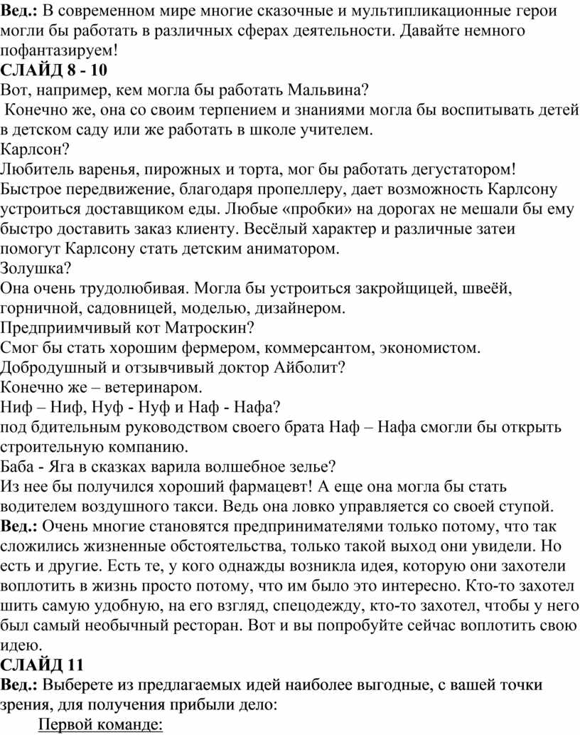 Вед.: В современном мире многие сказочные и мультипликационные герои могли бы работать в различных сферах деятельности. Давайте немного пофантазируем!