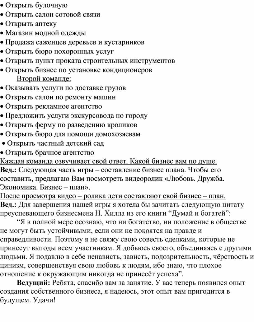 Ведущий: Ребята, спасибо вам за занятие. У вас теперь появился опыт создания собственного бизнеса, я надеюсь, этот опыт вам пригодится в будущем. Удачи!