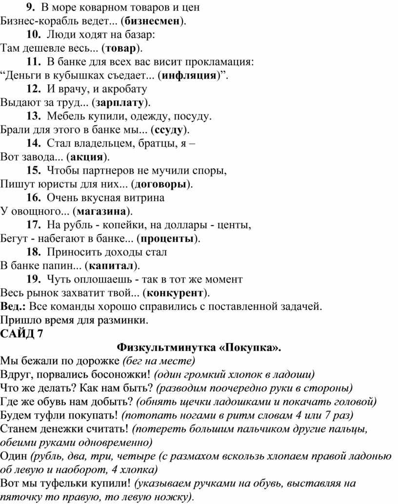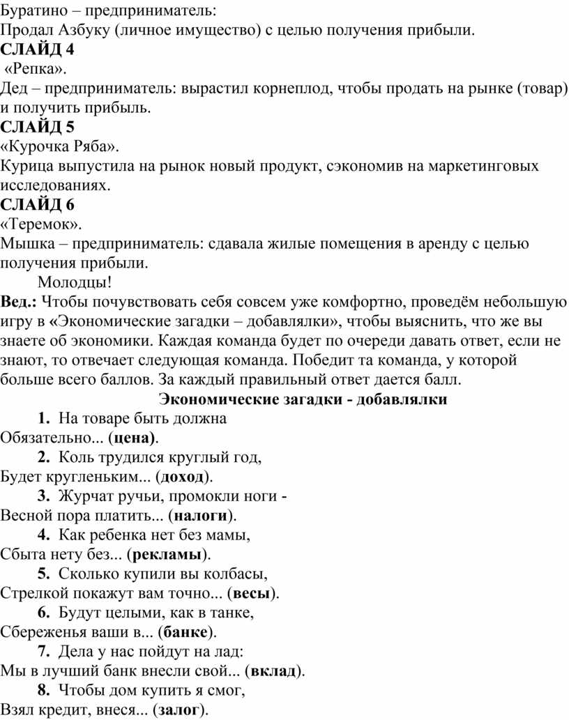 Вед.: Чтобы почувствовать себя совсем уже комфортно, проведём небольшую игру в «Экономические загадки – добавлялки», чтобы выяснить, что же вы знаете об экономики. Каждая команда будет по очереди давать ответ, если не знают, то отвечает следующая команда. Победит та команда, у которой больше всего баллов. За каждый правильный ответ дается балл.