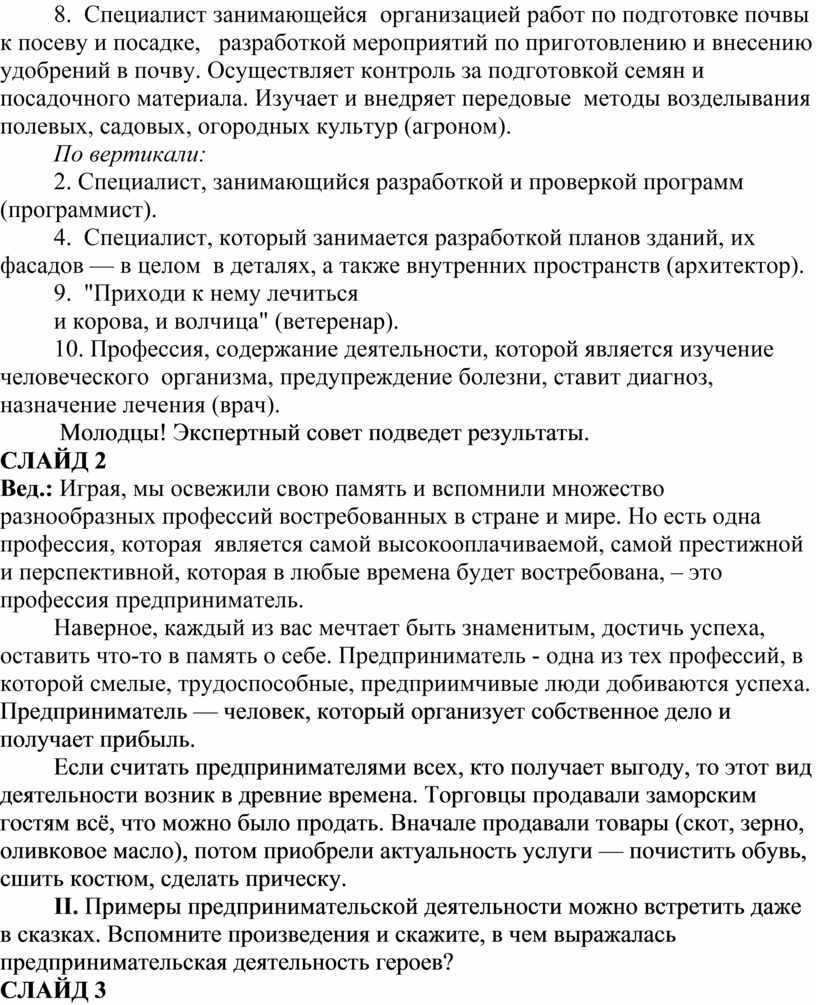 Вед.: Играя, мы освежили свою память и вспомнили множество разнообразных профессий востребованных в стране и мире. Но есть одна профессия, которая является самой высокооплачиваемой, самой престижной и перспективной, которая в любые времена будет востребована, – это профессия предприниматель.