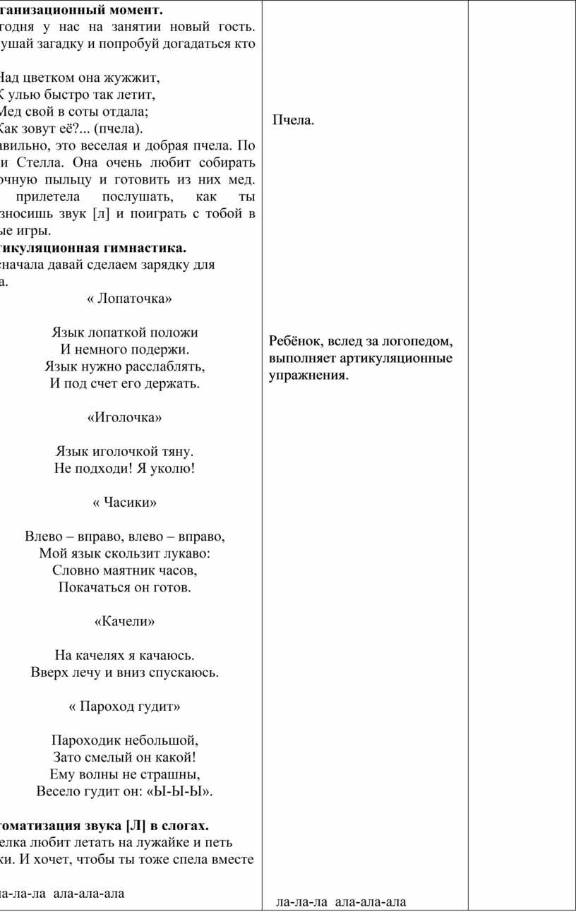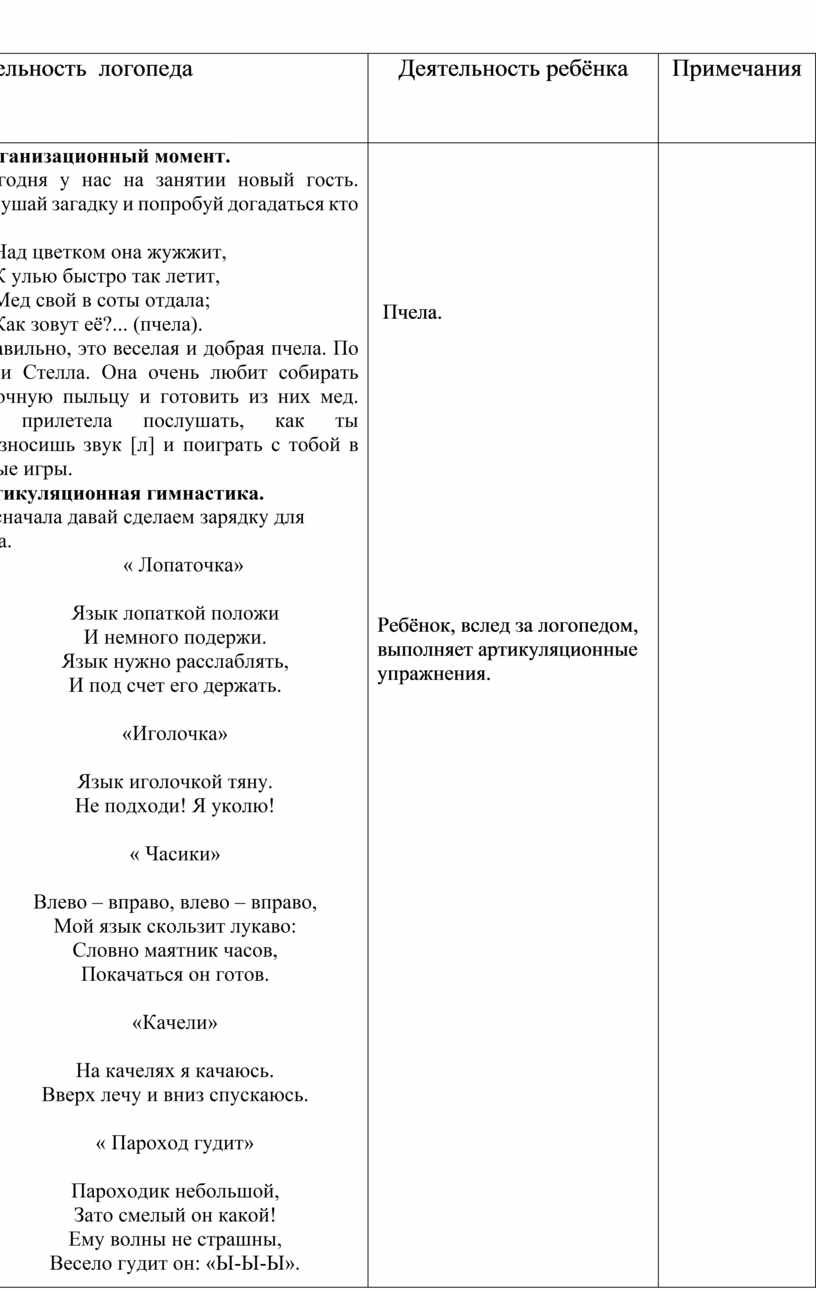 1 Организационный момент. - Сегодня у нас на занятии новый гость. Послушай загадку и попробуй догадаться кто это? Над цветком она жужжит, К улью быстро так летит, Мед свой в соты отдала; Как зовут её?... (пчела). - Правильно, это веселая и добрая пчела. По имени Стелла. Она очень любит собирать цветочную пыльцу и готовить из них мед. Она прилетела послушать, как ты произносишь звук [л] и поиграть с тобой в разные игры. 2. Артикуляционная гимнастика. - Но сначала давай сделаем зарядку для язычка. « Лопаточка»
