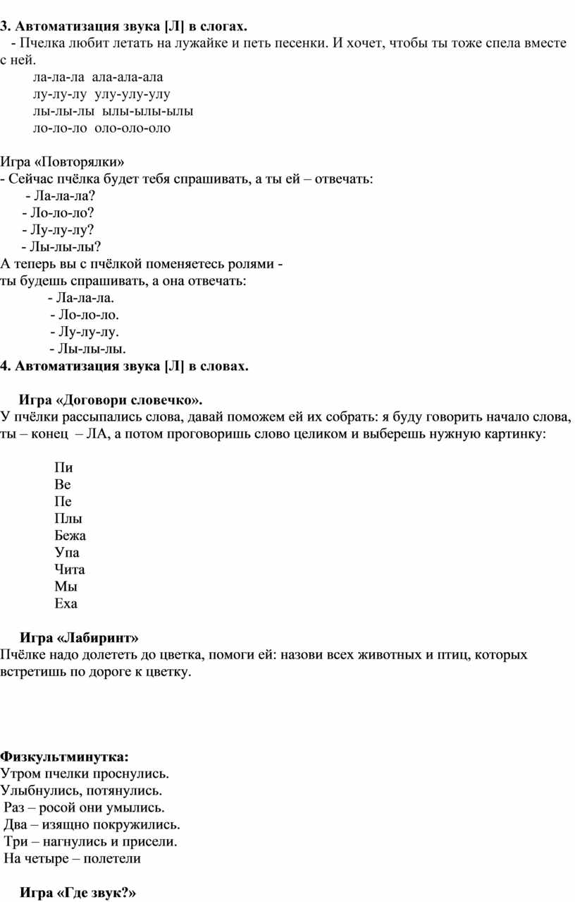 Игра «Повторялки» - Сейчас пчёлка будет тебя спрашивать, а ты ей – отвечать: - Ла-ла-ла? - Ло-ло-ло? - Лу-лу-лу? - Лы-лы-лы? А теперь вы с пчёлкой поменяетесь ролями - ты будешь спрашивать, а она отвечать: - Ла-ла-ла. - Ло-ло-ло. - Лу-лу-лу. - Лы-лы-лы. 4. Автоматизация звука [Л] в словах.